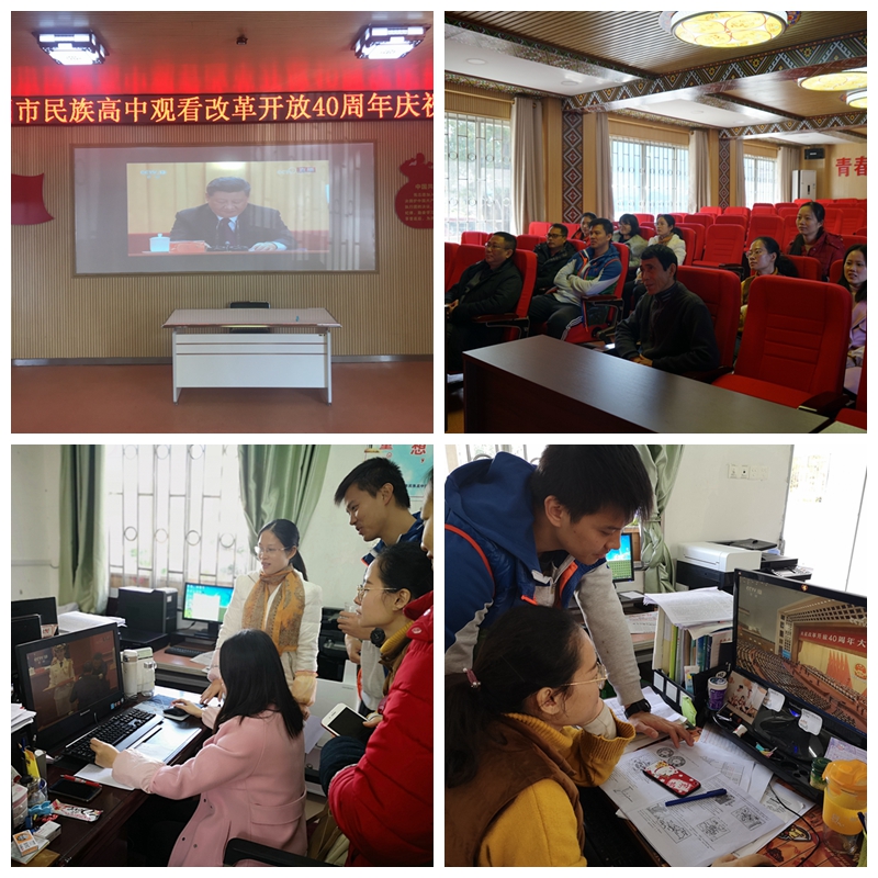 2018年12月18日,我校领导带领学校师生通过一楼多媒体教室直播、校内大屏幕、电脑网络、电视等多种途径收看庆祝改革开放40周年大会实况。