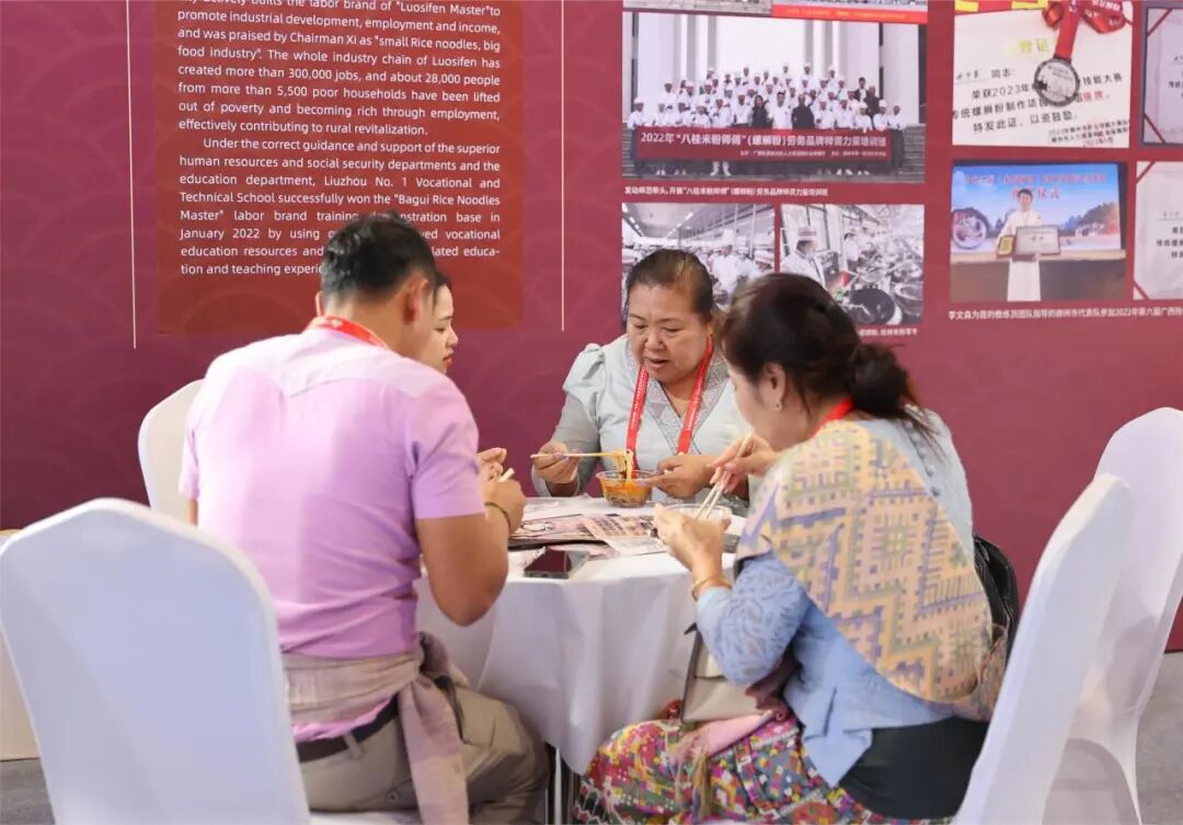 11月3-4日,以“聚智汇力 同创共享”为主题的中国—东盟人力资源合作与开发论坛暨中国—东盟人力资源服务博览会(以下简称“人博会”)在南宁国际会展中心举办,我校副校长谢文峰带队参加了中国—东盟非物质文化遗产传承人技能技艺成果展,我校自治区级“八桂米粉师傅”劳务品牌专家工作室主持人李文森老师就学校“八桂米粉师傅”(螺蛳粉)劳务品牌培训示范基地建设成果进行展出。
