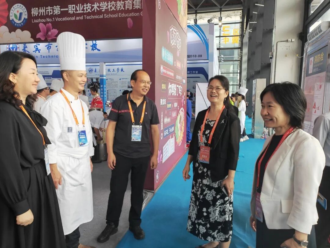 展出期间,广西壮族自治区人力资源和社会保障厅党组书记、厅长唐标文莅临我校展位参观指导。来自国内各地的政府、企事业单位嘉宾到我校展位参观交流并品尝我校制作的螺蛳粉。