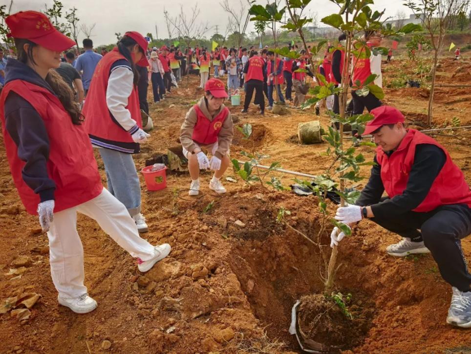 清晨阳光洒满植树现场,柳州二中志愿者们身着红色马甲,携带锄头、铲子、水桶等工具,于 9:00 前准时集结完毕。大家严格遵守活动要求,有序停放车辆,迅速投入热火朝天的劳动中。活动现场分工明确、配合默契:有的挥锹铲土,为新苗开辟生长空间;有的扶正苗木,确保根系稳固;有的培土围堰,筑牢保水屏障;有的提水浇灌,为新绿注入活力。挥舞的铁锹、忙碌的身影与挺拔的树苗相映成趣,构成春日里一幅动人的生态画卷。