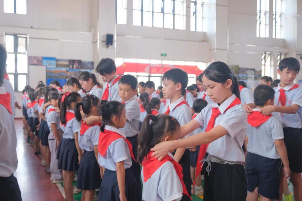 大队辅导员率先宣读新队员名单。随后,老队员代表手捧整齐的红领巾,为新队员郑重佩戴 —— 这抹象征红旗一角的红领巾。在歌曲的旋律中完成使命交接,新老队员互敬队礼的瞬间,定格成红色精神传承的鲜活画面。