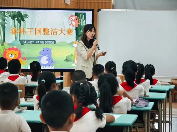 首先是 241 班的开放课。黄柳妮老师率先执教数学课《逐层分类》,她引导学生通过小组合作动手操作,从 “单一标准分类” 逐步过渡到 “形状→数扣子个数→颜色” 的逐层细化分类,充分展现出低段教学 “玩中学、学中思” 的鲜明特色。