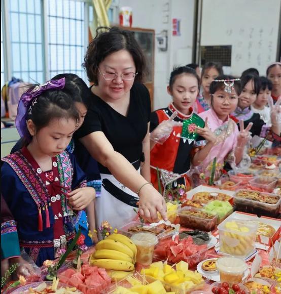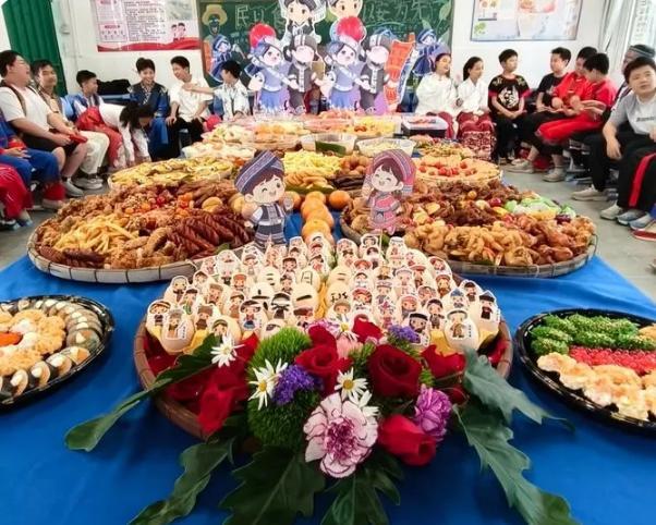 为保障活动圆满开展,学校提前周密部署、精心筹备。各班教室化身独具壮乡风情的长桌宴会场,整洁素雅的桌布铺陈整齐,鲜花、贴纸、簸箕等壮乡特色装饰错落摆放,浓郁的民族节日氛围扑面而来,让校园处处洋溢着“三月三”的喜庆气息。学校同步制作“三月三”特色美食主题课件,贴上餐桌文明礼仪标语,将“善 美”文化融入每一处环境布置,让活动场地成为滋养学生美好品行的生动课堂。