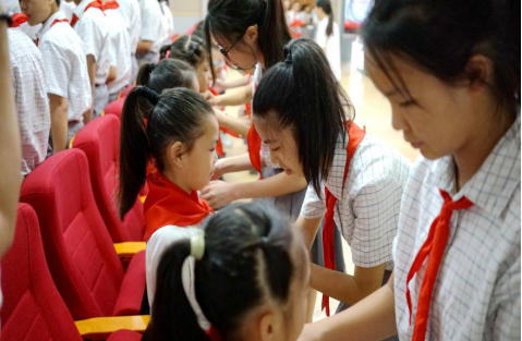 红色薪火代代传,星星火炬耀成长。集团少工委主任黄珺书记宣布新队员名单,在师生的共同见证下,新队员们用炽热的目光迎接这光荣的时刻,随着《红领巾飘起来》的歌曲奏响,老队员们双手捧着红领巾,迈着坚定地步伐走向新队员,为新队员佩戴上鲜艳的红领巾。
