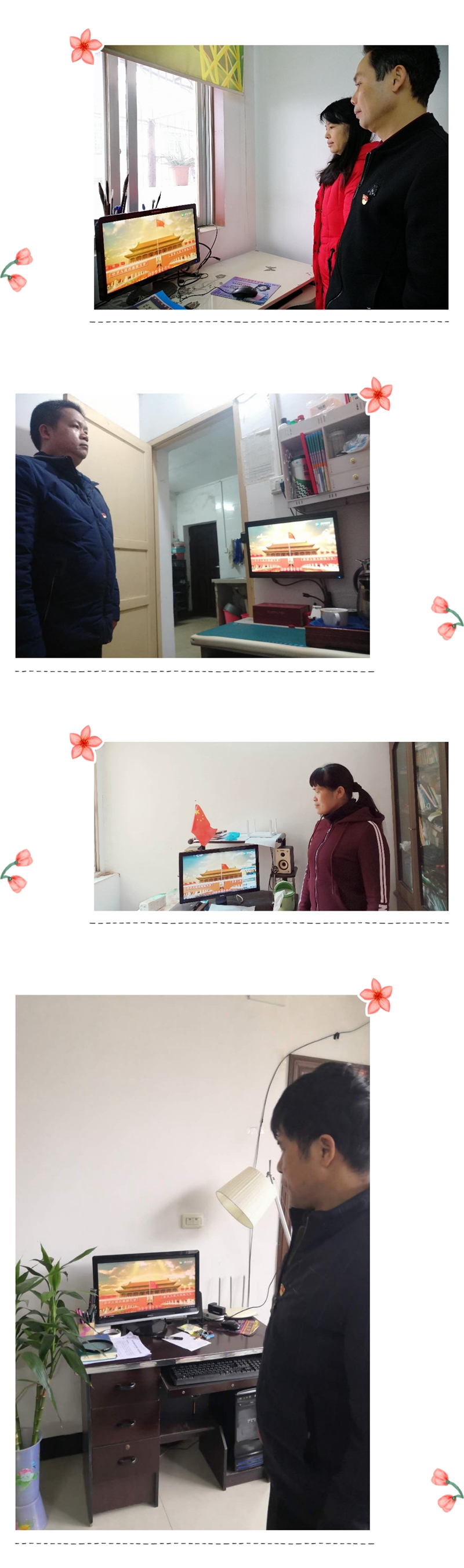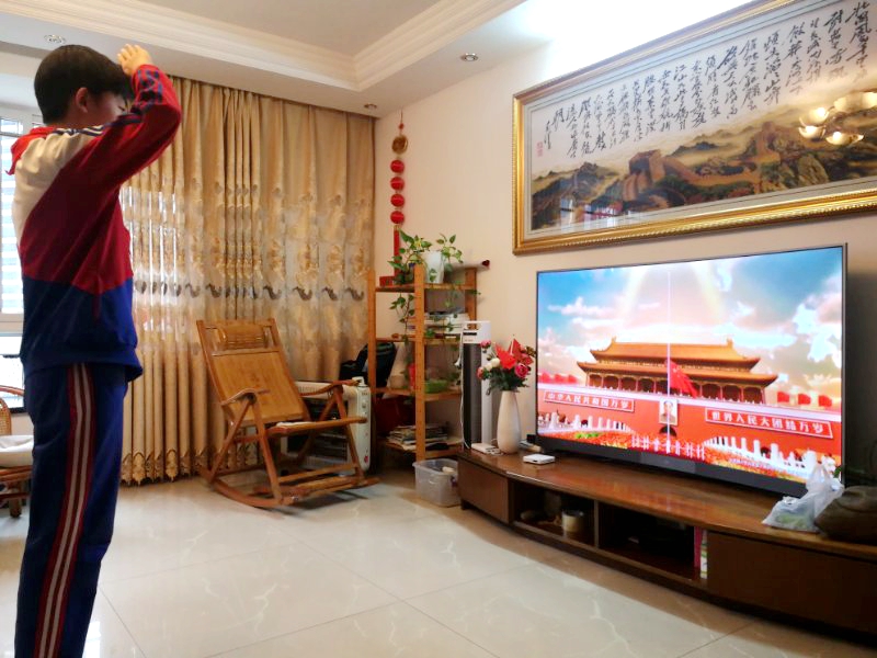 学生们在家中电视、电脑、手机前,看着屏幕上的国旗冉冉升起,向国旗肃穆敬礼。