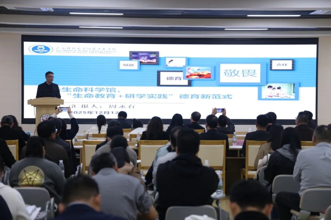在经验交流环节,四所院校的代表先后分享了各具特色的德育实践与思考。广西商业学校校长助理杨林钟以《我们是一片莲》为题,阐释了“莲润五心”德育模式的内涵与实践;柳州城市职业学院副校长周巍分享了《“五维赋能”锻造新时代“匠心”与“匠魂”》的创新举措;柳州市第一职业技术学校副校长林博韬介绍了学校《筑法治之基,育时代工匠》的法治育人模式探索;广西科技大学附属卫生学校副校长周永有则聚焦《依托生命科学馆,构建“生命教育+研学实践”》的实践路径。精彩纷呈的分享为与会者提供了宝贵的经验借鉴。