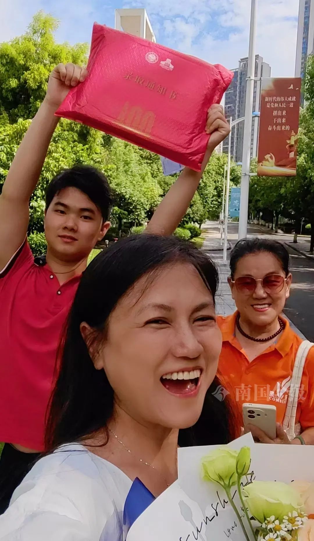 杨骐嘉和妈妈(前)、大姨到学校领取大学录取通知书。受访者供图