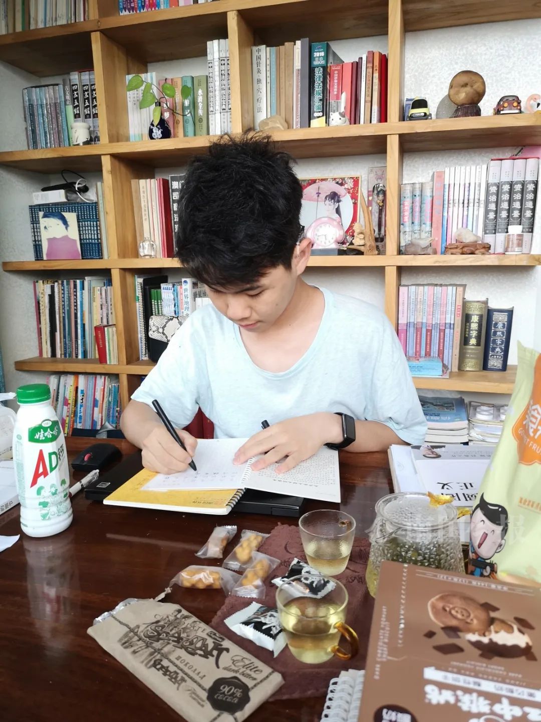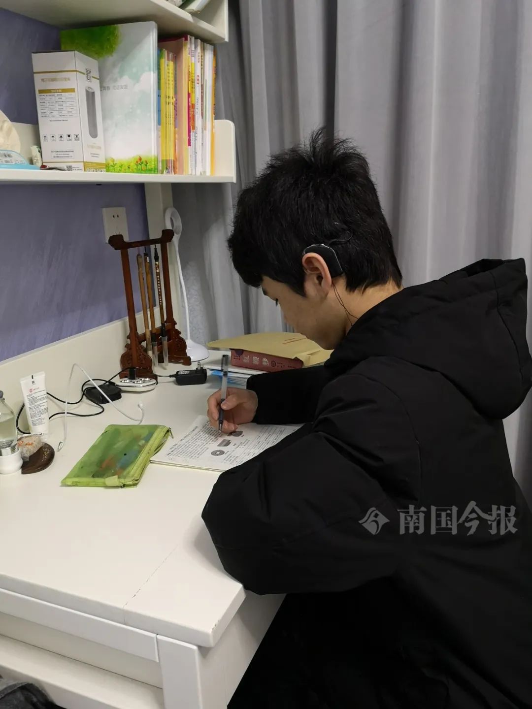 杨骐嘉在学习,他左耳做了人工耳蜗,右耳佩戴助听器。受访者供图