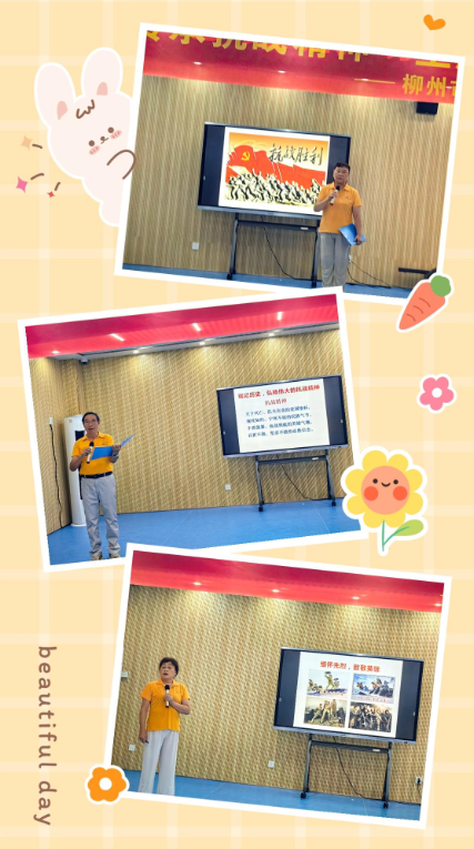 活动中,柳州市教育局关工委宣讲团讲师罗崎、李贤芳、梁小玲分别围绕“铭记历史,勿忘国耻”“同仇敌忾,奋起反抗”“缅怀先烈、致敬英雄”“传承精神,继往开来”等专题进行了宣讲。三位老师以饱满的情感、生动的讲述,将学生带入抗日战争的历史场景中,让大家深切感受到日寇侵华的残酷罪行、中国人民英勇抗战的顽强斗志以及英雄先辈们舍生忘死的不屈精神。学生们在历史的回望中,更加为今日中国的强大感到自豪。