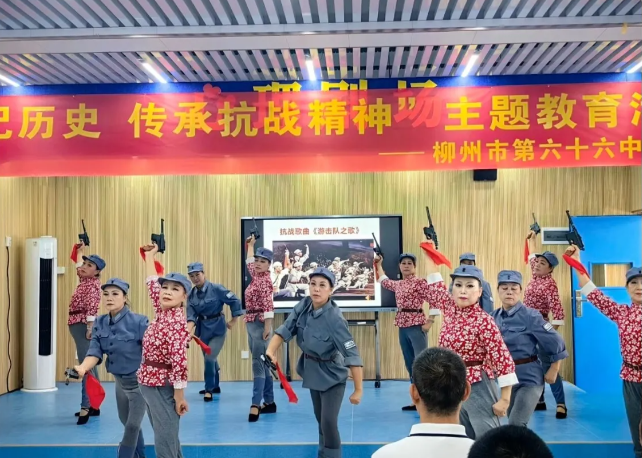 柳州市教育局关工委“爱心艺术团”的“五老”志愿者也以真挚的情感和优美的舞姿,配合主题宣讲献上了精彩节目。舞蹈《游击队之歌》《歌唱二小放牛郎》展现了中国人民不畏强暴、血战到底的英雄气概;《咏梅》《红旗颂》则让学生感受到祖国繁花似锦、欣欣向荣的蓬勃气象。