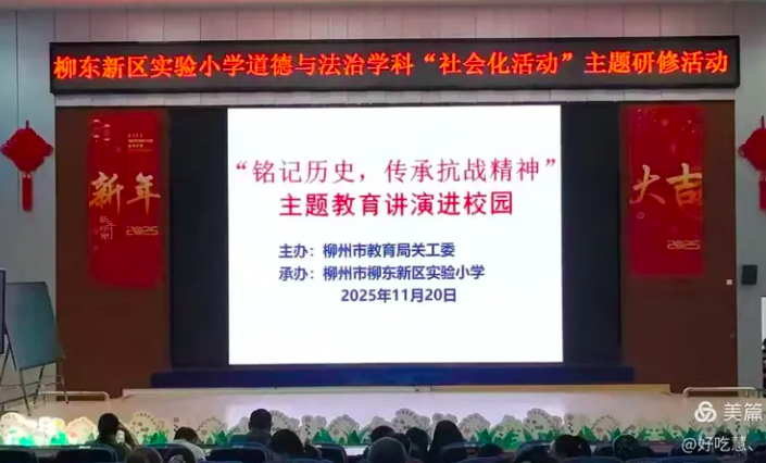 为纪念中国人民抗日战争暨世界反法西斯战争胜利80周年,引导广大青少年铭记历史、缅怀先烈、传承红色基因,近日,柳州市教育局关工委走进柳州市柳东新区实验小学,带来“铭记历史,传承抗战精神”主题讲演展示活动,为师生呈现了一堂生动深刻的爱国教育课。