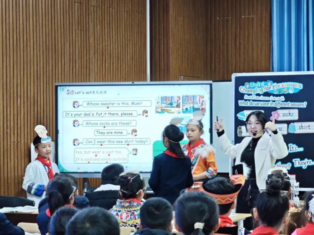 融水镇水东小学会场以四年级Unit6 Changing for the seasons Part A Let's talk 为共研课例,融水苗族自治县小学英语名师工作室成员肖芳老师,与城区教坛新秀柳南区实验小学阳依芯老师同台“同课异构”。两位教师分别以趣味情境互动、分层任务驱动的方式,将民族文化和跨学科知识融入课堂之中,将语言学习与生活实践紧密结合,生动诠释了新课标“以生为本”的教学理念。