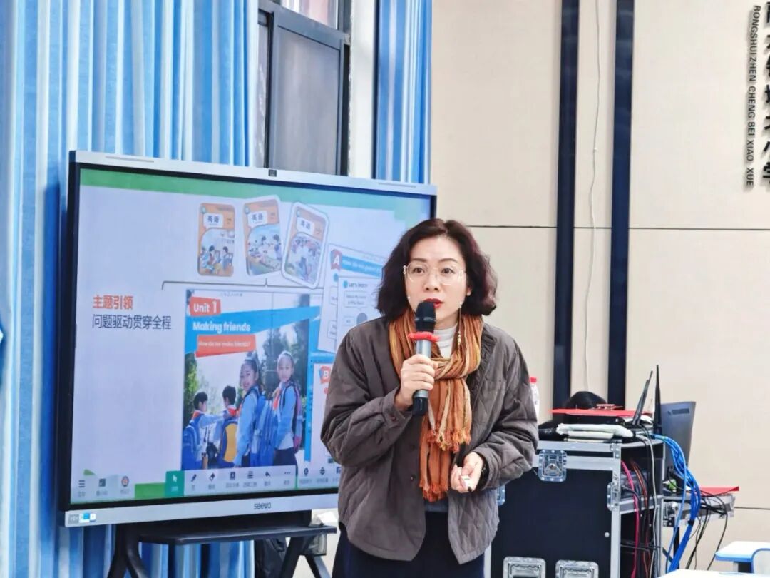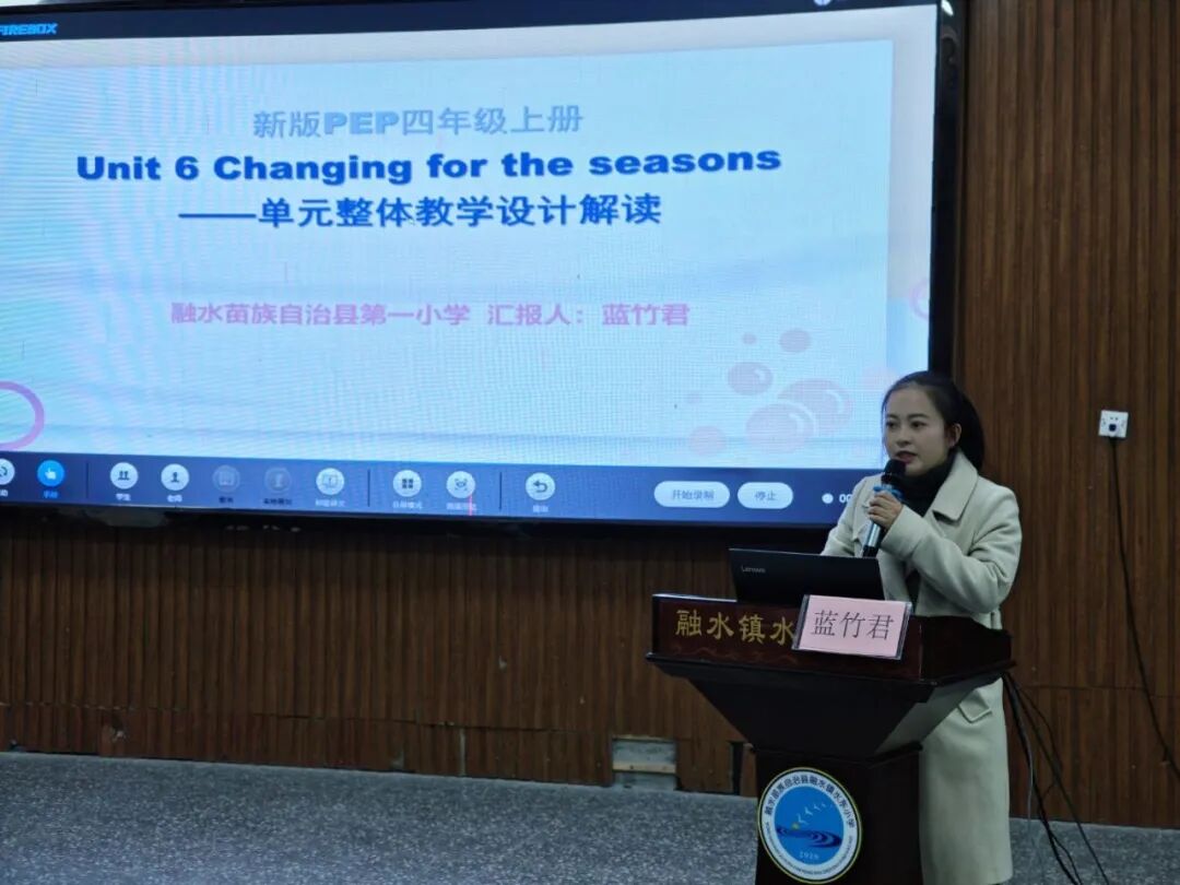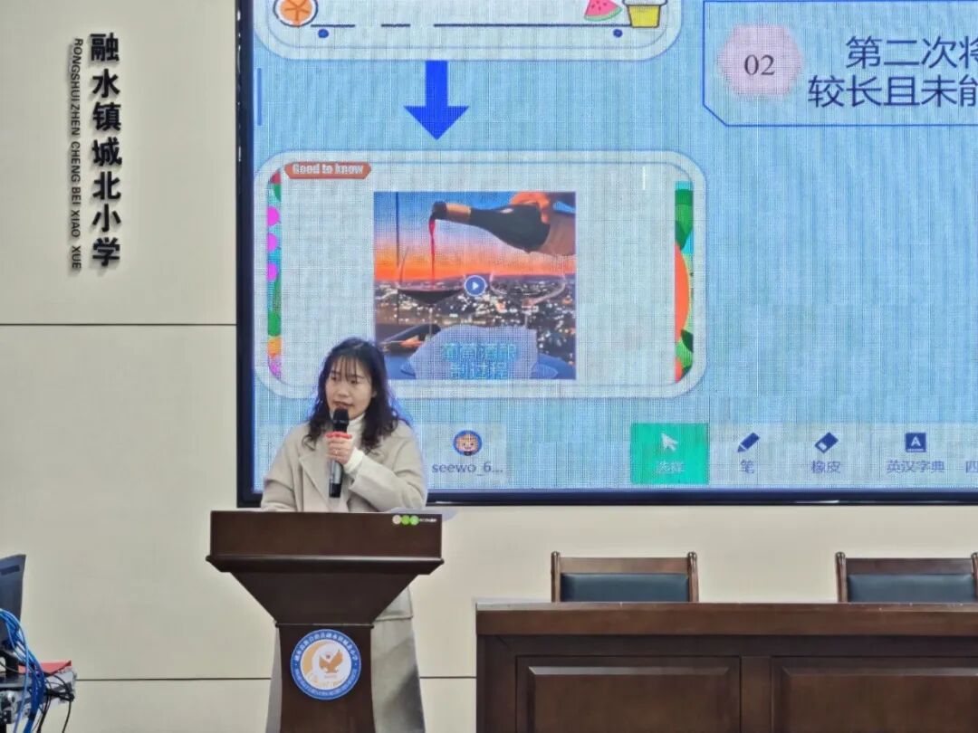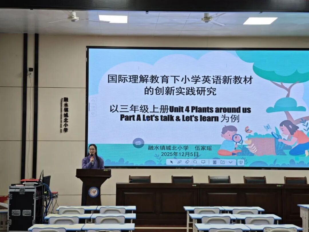 融水镇城北小学会场聚焦 Plants around us 主题,伍家瑶老师以说课形式解析新教材育人价值,提出“主题引领、问题驱动”的教学路径;全攀婷老师以“糖葫芦”为情境载体,将词汇句型教学与环保理念、传统文化相融合,实现了语言能力与素养提升的双重目标。韦唯老师分享了团队磨课历程,李芳老师结合专家指导交流教学反思,进一步凝聚了“以研提质”的共识。