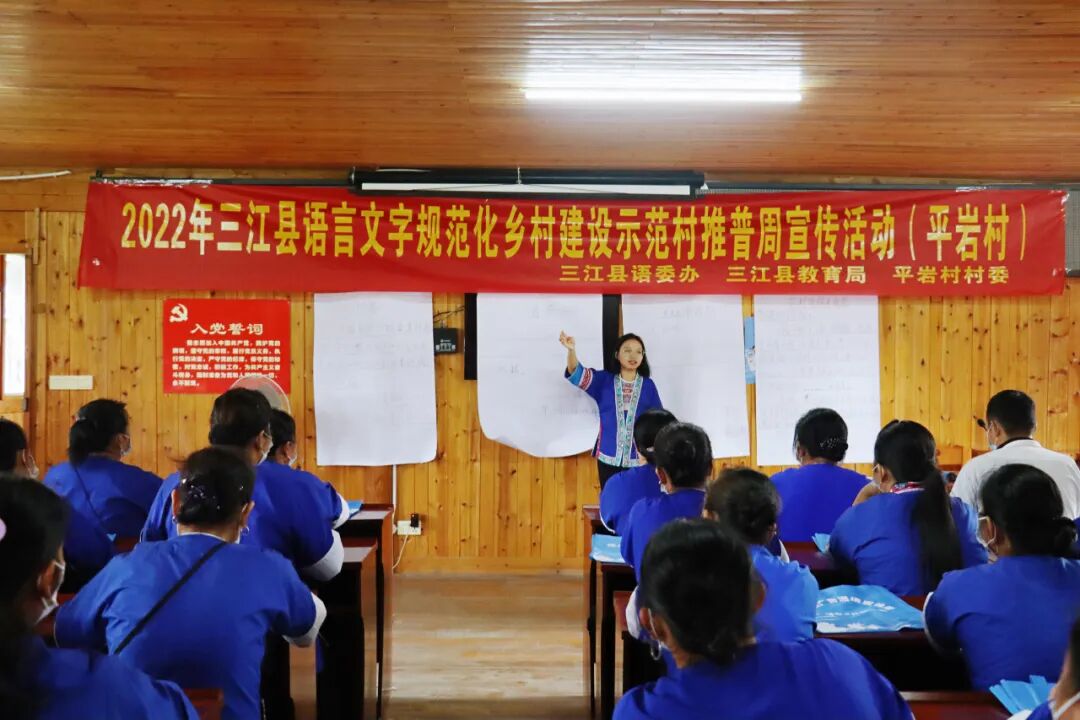 三江林溪镇平岩村是三江首个定点语言文字规范化乡村建设示范村。自2021年5月自治区在平岩村启动语言文字规范化示范村建设工作以来,平岩村开展了形式多样的推普学普活动,通过多措并举创示范、营造氛围创示范、总结经验创示范,促进平岩村语言文字规范化乡村建设进一步提升。如今的平岩村大力推广使用普通话,并由此致富的村民越来越多,村民有了很大改变,村子的面貌也焕然一新。不管是走出大山的青壮年劳动力,还是扎根家乡的男女老少,80%村民均具备使用普通话进行日常沟通的能力,人们的生活水平日渐提高。今年以来,仅是平岩村岩寨屯就承办了215场百家宴,接待各地游客4万余人,村民的收入相当可观。