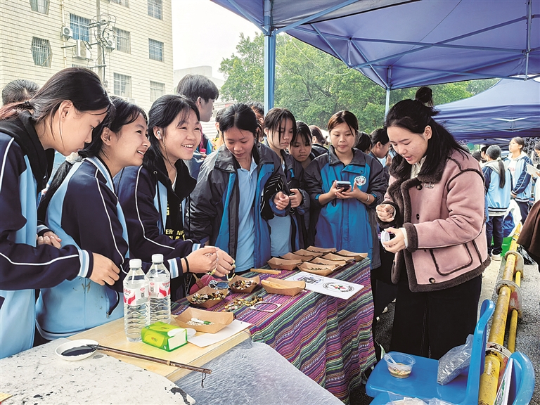 活动当日细雨蒙蒙,却丝毫未减现场的热烈氛围。校园内,各职业院校社团展示摊位前人头攒动,电商运营实操演示、特色点心现场制作、室内设计佳作陈列等活动丰富多彩。“我们结合二十四节气,创新设计了具有柳州本土特色的点心。”广西商业学校烹饪营养系学生吴冬雪热情地向观众介绍作品亮点。学子们在实操展演中大展身手,生动彰显出职业教育“德技并修”的独特育人风采。