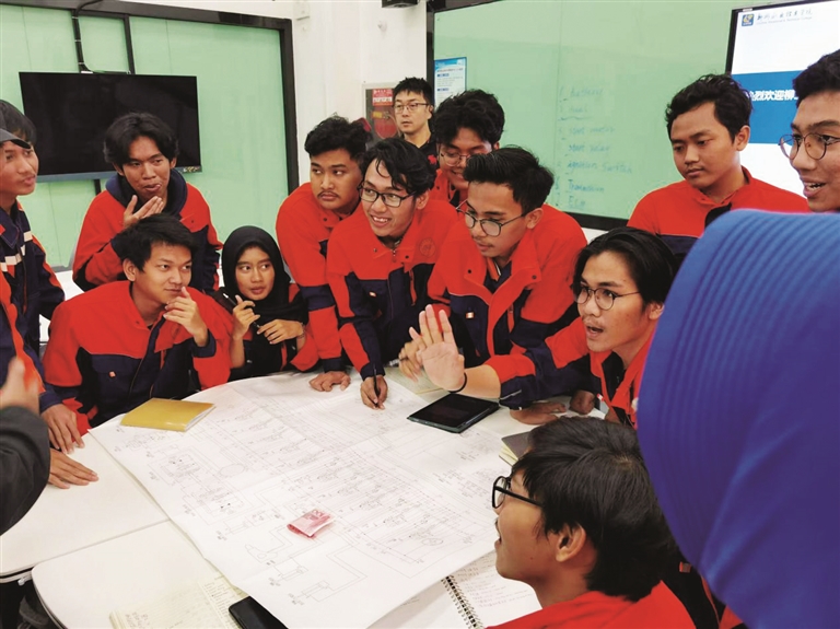 在印度尼西亚雅加达国立理工学院,学生们系统学习汉语和工程机械相关知识;在泰国正大管理学院,学校教师参照中国教学标准开展教学;在深南电路的车间里,中泰学生结成学习“搭子”,在沉浸式实训氛围中学习技能……
