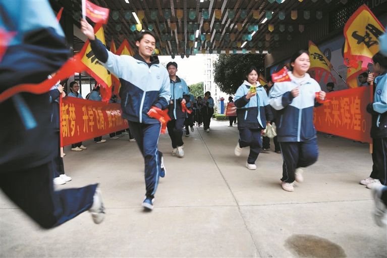 同样的场景也出现在柳州市第二职业技术学校。“加油!加油!”当天清晨,学校校园内加油声、欢呼声此起彼伏,老师们自发站成一排,面带微笑,为即将乘坐大巴奔赴各考点的考生们加油鼓劲。考生们挥手回应,眼神中满是坚定与憧憬,带着老师的祝福和自己的信念奔赴考场。