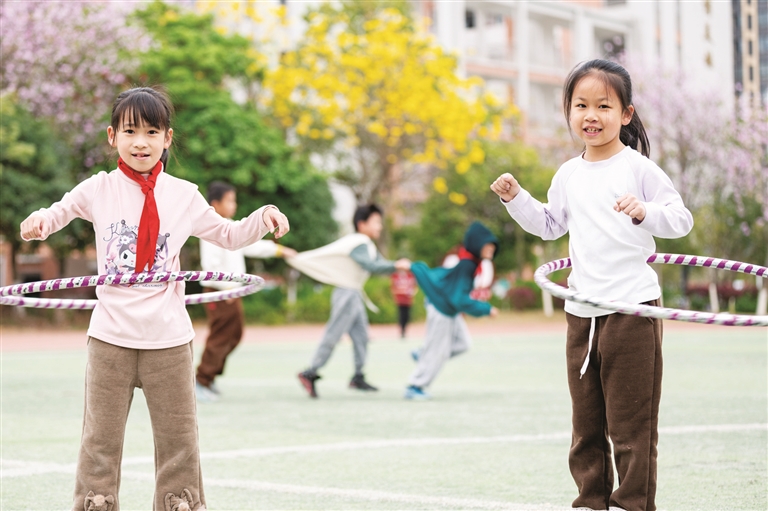 孩子们在操场玩起呼啦圈。