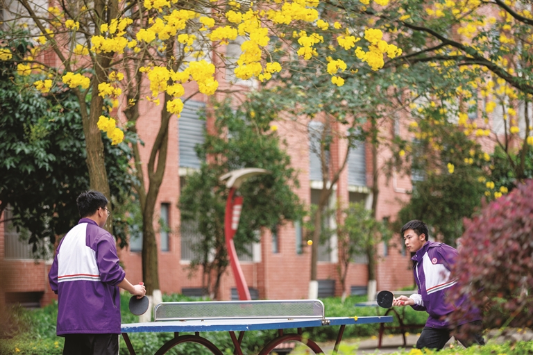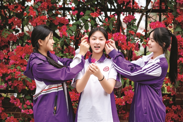 火红的三角梅像一团团小火苗,金灿灿的黄花风铃木开满枝头,还有紫色的蔓马缨丹……在柳州铁一中学柳东校区,花儿一朵接着一朵盛开,每一朵花都以自己的方式“宠爱”着学生们。