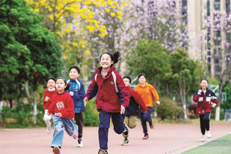 柳南区实验小学教育集团尚美校区内,孩子们在操场上奔跑。