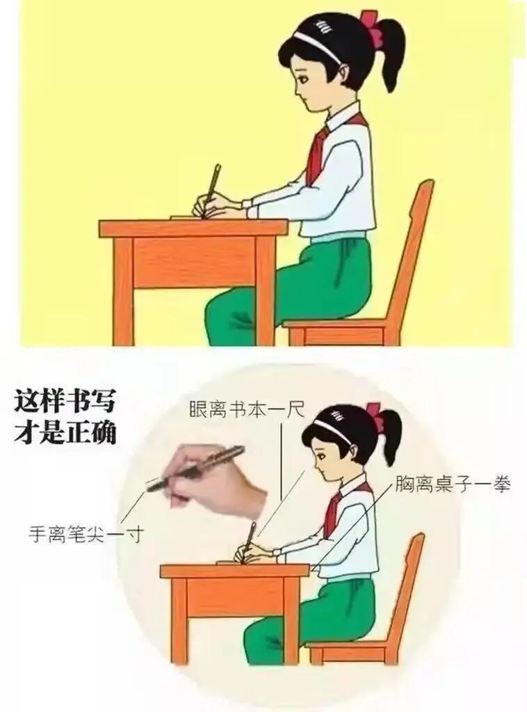1. 读书、写字姿势要端正,保持“一尺一寸一拳”,即眼睛与书本的距离要保持一尺(33厘米)以上;身体与课桌之间保持一个拳头(6-7厘米)的距离;握笔时手和笔尖要保持一寸(3.3厘米)的距离。