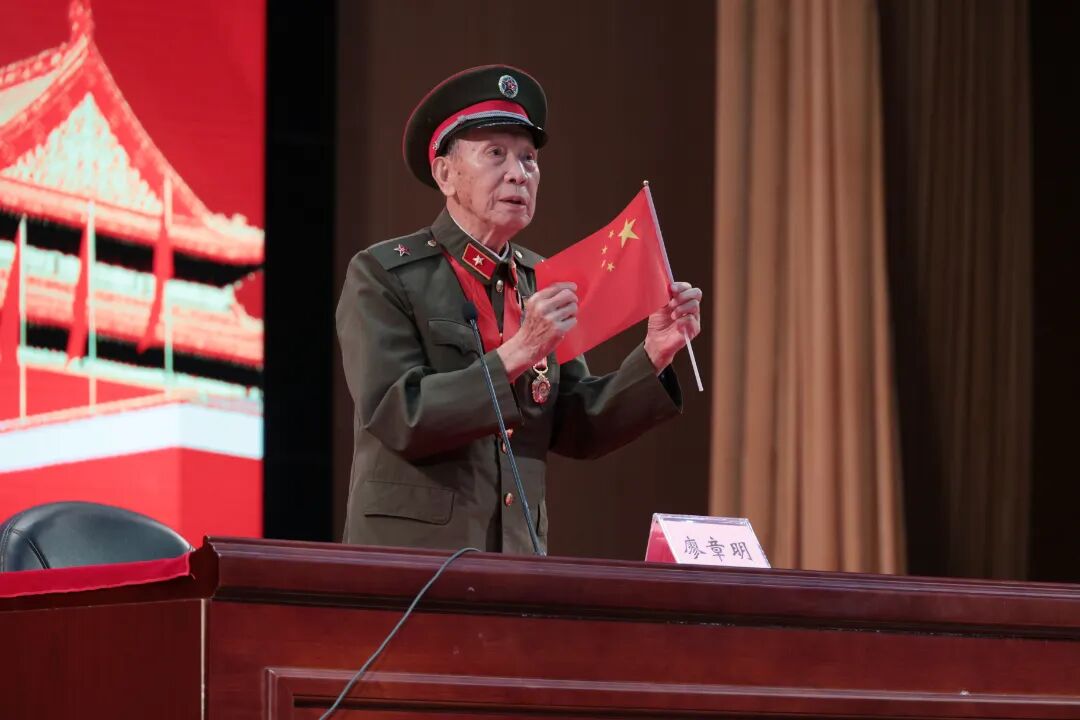 伴随着庄严雄壮的国歌,国防教育培训会正式开始。 “在战场上,大家脚上都磨起了泡、手上也磨破了皮,但我们仍然在烈日下坚持快速行军,按时到达了位置。”荣获朝鲜民主共和国授予军功章的军休干部廖章明激情澎湃地向师生们讲述着他在抗美援朝战争中,与战友们同甘共苦、并肩作战的故事,同学们认真倾听,仿佛回到了铁骨铮铮的革命年代,感受革命先辈艰苦奋斗、无私奉献、舍身报国的精神。