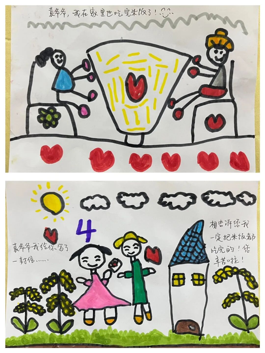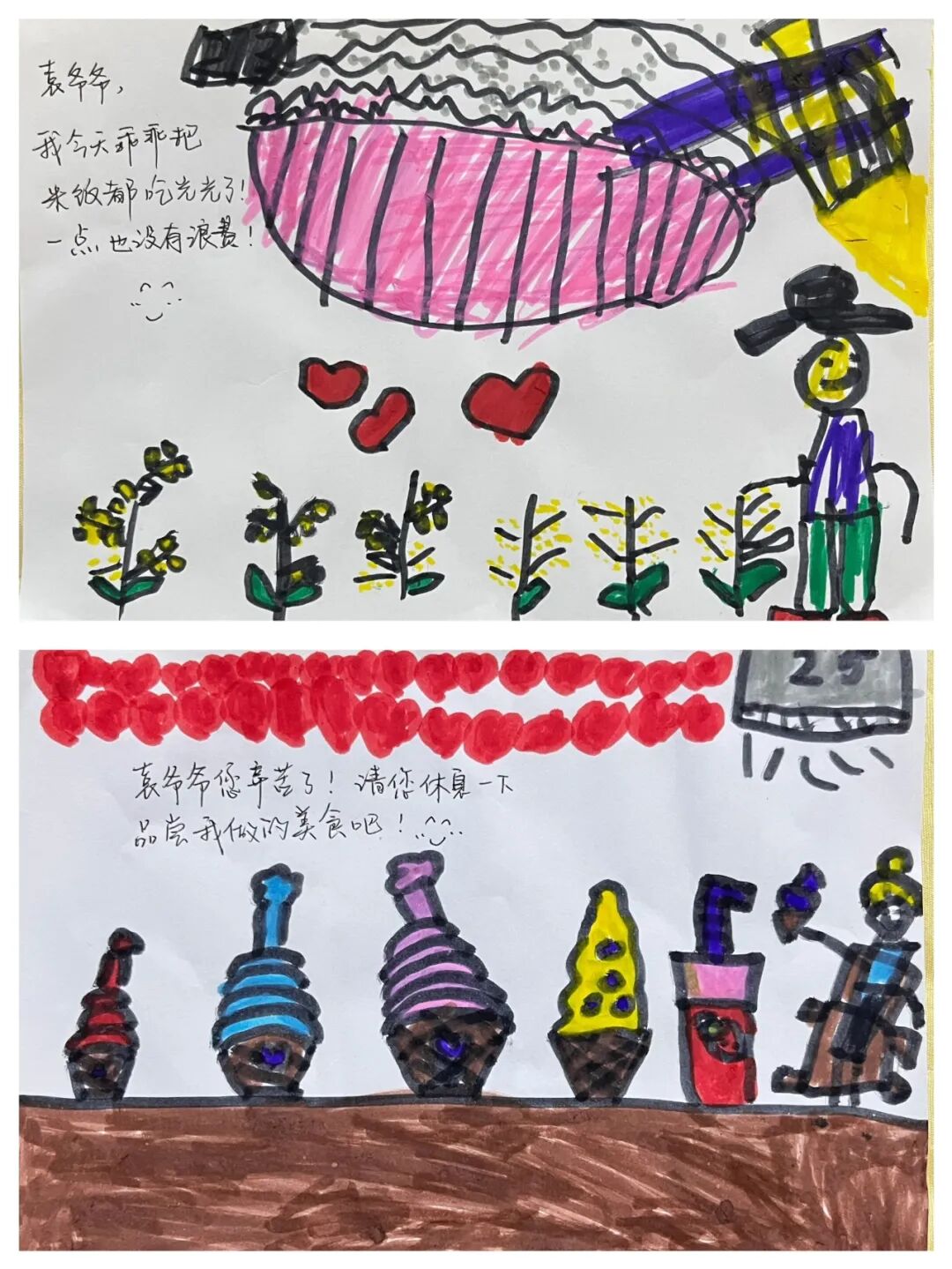 通过观看《袁隆平爷爷与杂交水稻的故事》视频,孩子们认识了袁隆平爷爷,了解了杂交水稻,还用稚嫩的画笔表达对袁爷爷的敬佩和感谢。