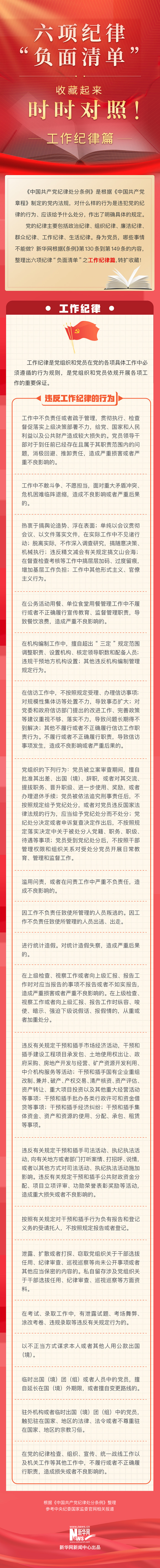 当前,全党正在开展党纪学习教育。这次党纪学习教育明确要聚焦解决一些党员、干部对党规党纪不上心、不了解、不掌握等问题,组织党员特别是党员领导干部认真学习《中国共产党纪律处分条例》,做到学纪、知纪、明纪、守纪,搞清楚党的纪律规矩是什么,弄明白能干什么、不能干什么,把遵规守纪刻印在心,内化为言行准则,进一步强化纪律意识、加强自我约束、提高免疫能力,增强政治定力、纪律定力、道德定力、抵腐定力,始终做到忠诚干净担当。新华网根据《条例》内容,整理出六项纪律“负面清单”。今天推出“负面清单”之工作纪律篇,一起收藏学习。