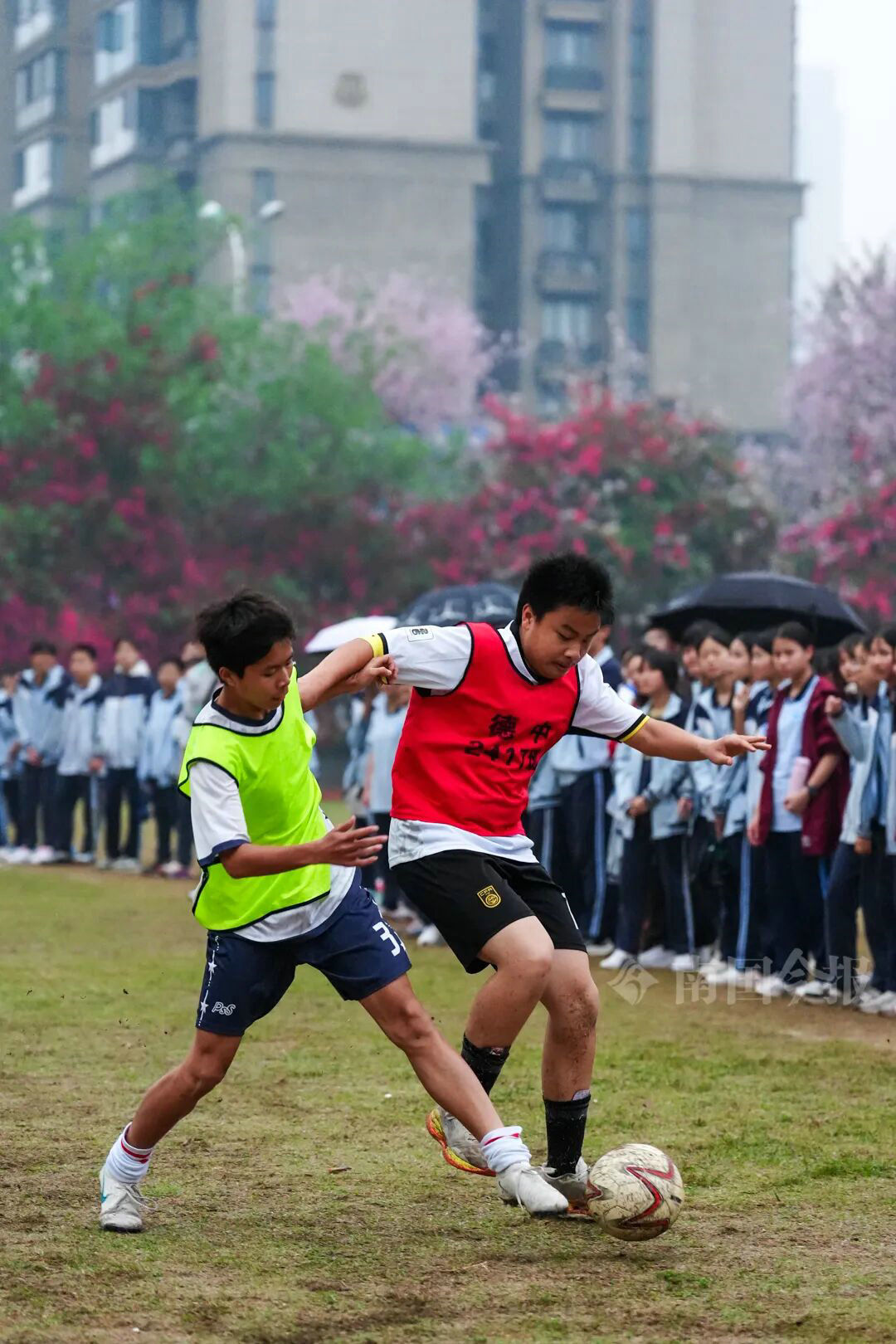4月2日下午,在德润中学足球联赛冠军、季军争夺赛,现场燃爆。绿茵场上少年拼劲足,传球如织,前锋变向甩防后抽射破门,看台下欢呼震耳;门将飞身扑球,将对方的单刀球稳稳按在身下……一个个精彩瞬间,让大家记忆深刻。