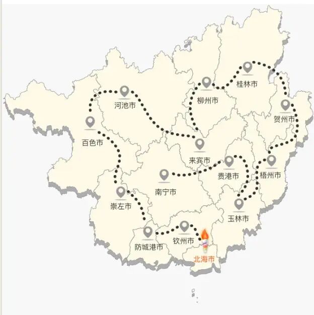 北海(第1天)—钦州(第2天)—防城港(第3天)—崇左(第4天)—百色(第5天)—河池(第6天)—来宾(第7天)—柳州(第8天)—桂林(第9天)—贺州(第10天)—梧州(第11天)—玉林(第12天)—贵港(第13天)—南宁(第14天)