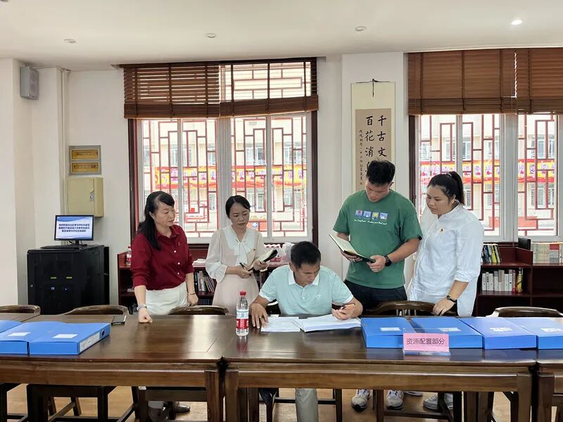 调研组专家查阅学校数据资料、查看功能室、随机走访师生