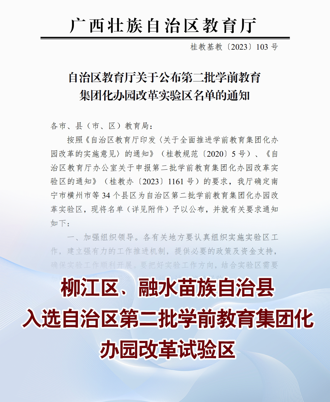● 我市4地入选自治区级3项实验区。柳江区、融水苗族自治县入选自治区第二批学前教育集团化办园改革试验区;柳北区、城中区入选自治区完善普惠性学前教育保障机制实验区;柳北区入选自治区级幼儿园保育教育质量提升试验区。